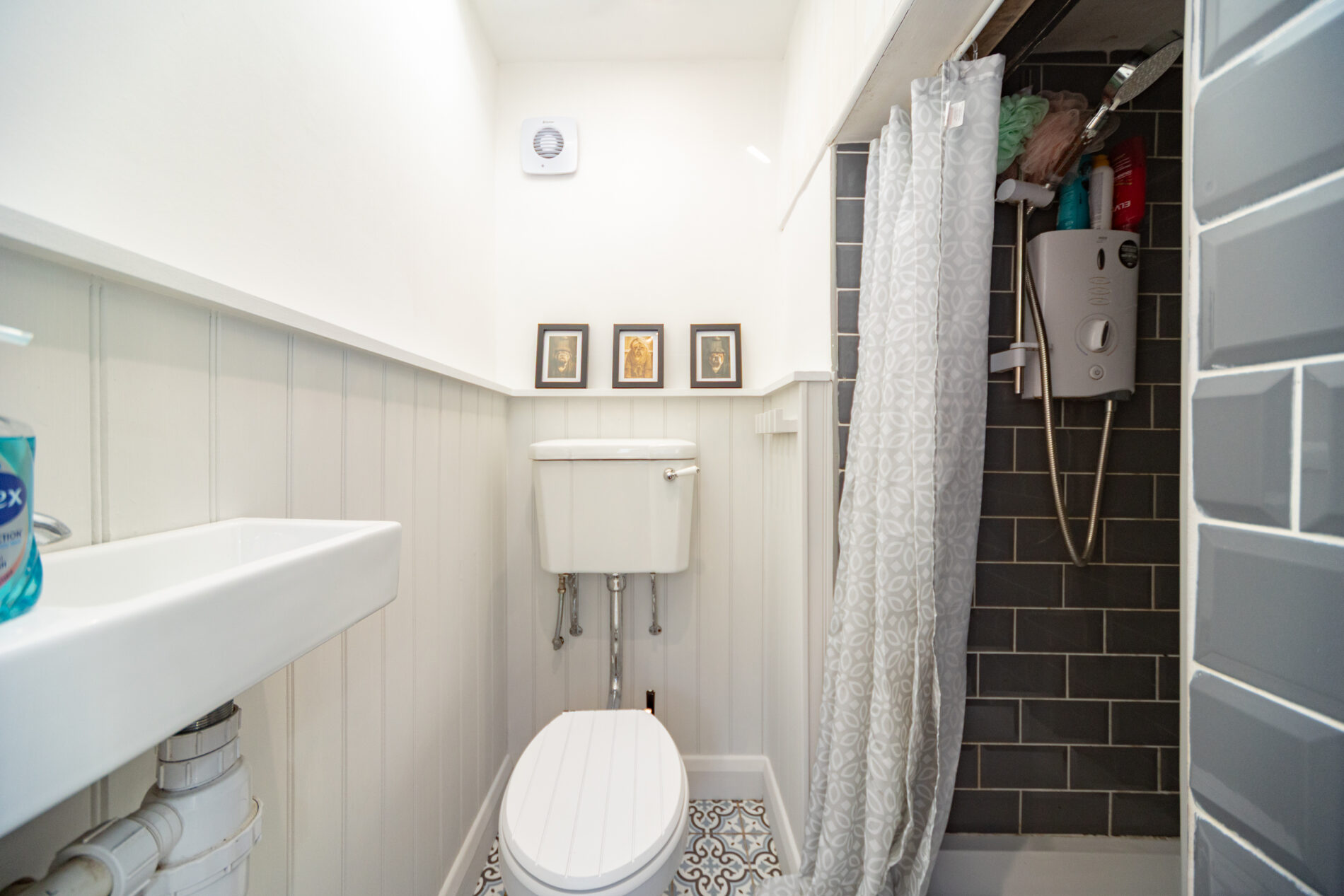 With a two piece suite in white comprising WC and micro wash basin plus shower cubicle with tiling, ceiling light point, panelling, tiled flooring and skylight.