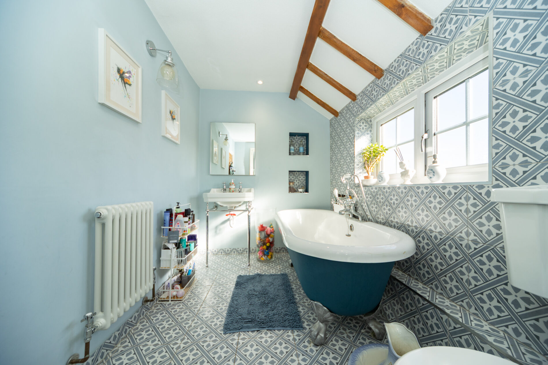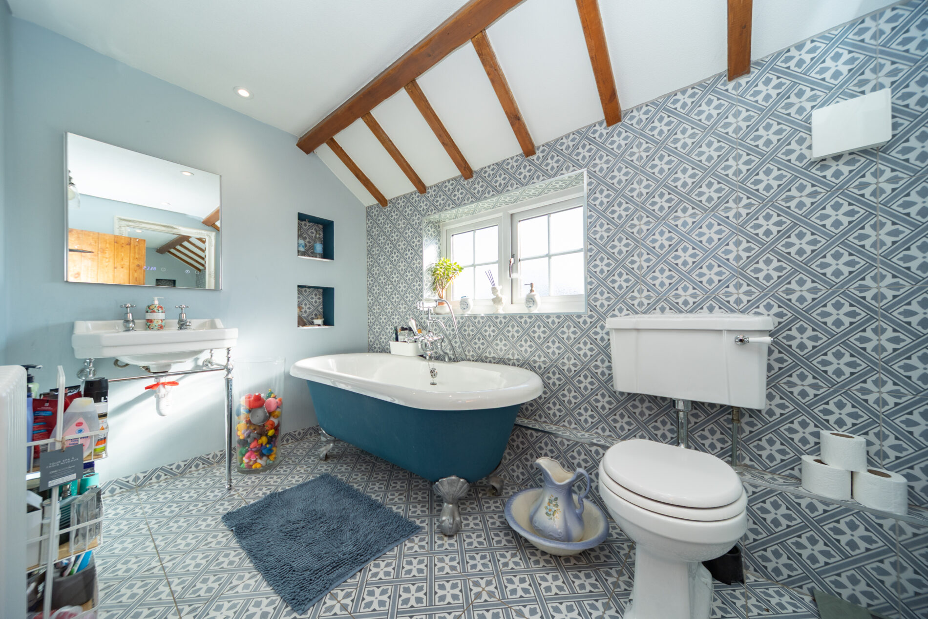 Having an attractive three piece suite comprising claw footed bath with shower mixer, vanity wash basin and WC. with geometric tiling to parts, ceiling light point, towel radiator and obscure double glazed window.