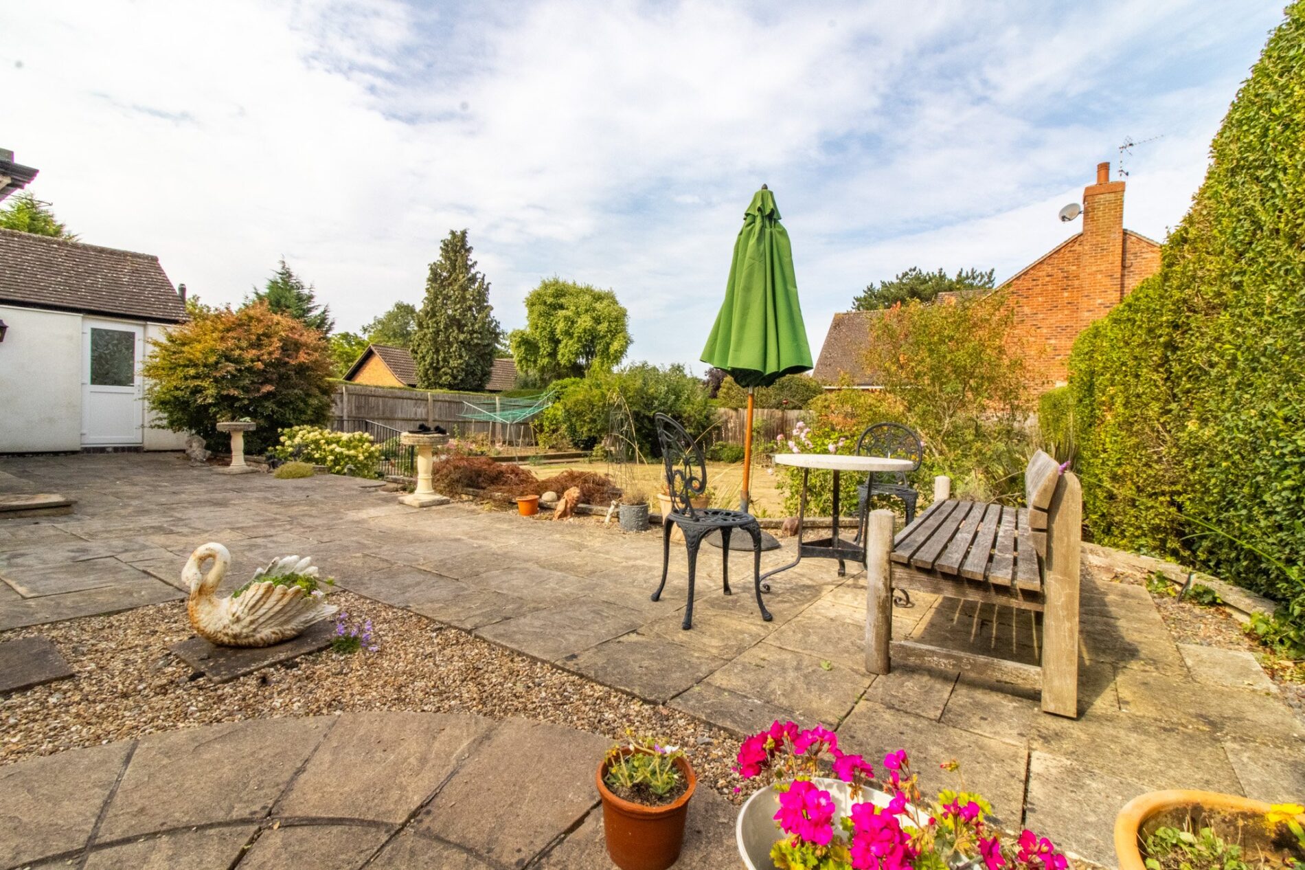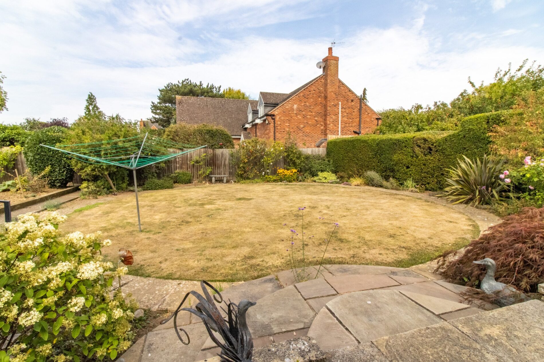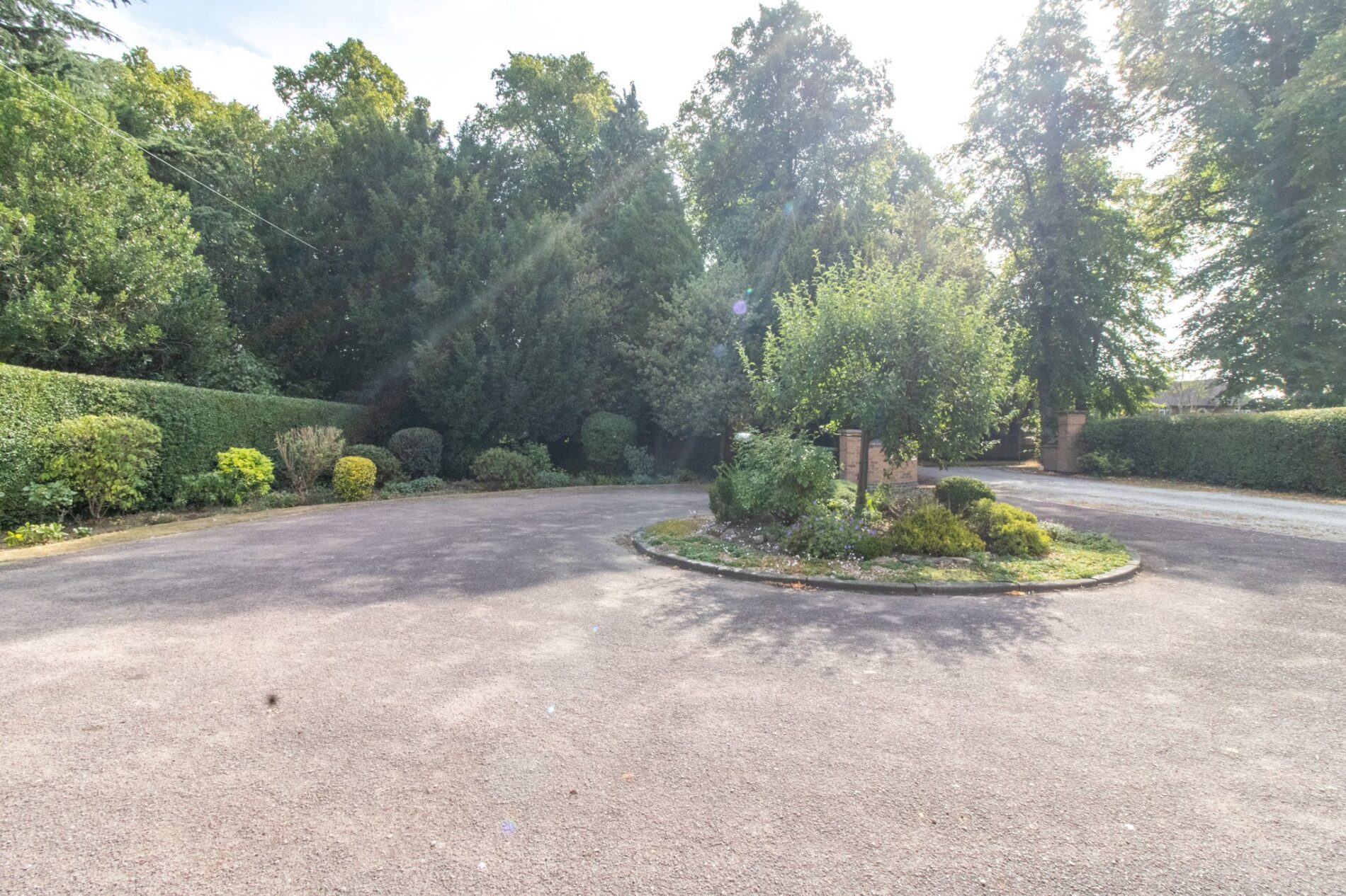 Turnaround circular driveway to front with central circular evergreen bed, natural screening frontage, car port parking to side. Large raised patio patio seating area to rear with steps leading to circular lawns with patio pathway and evergreen borders, further side vegetable garden area.