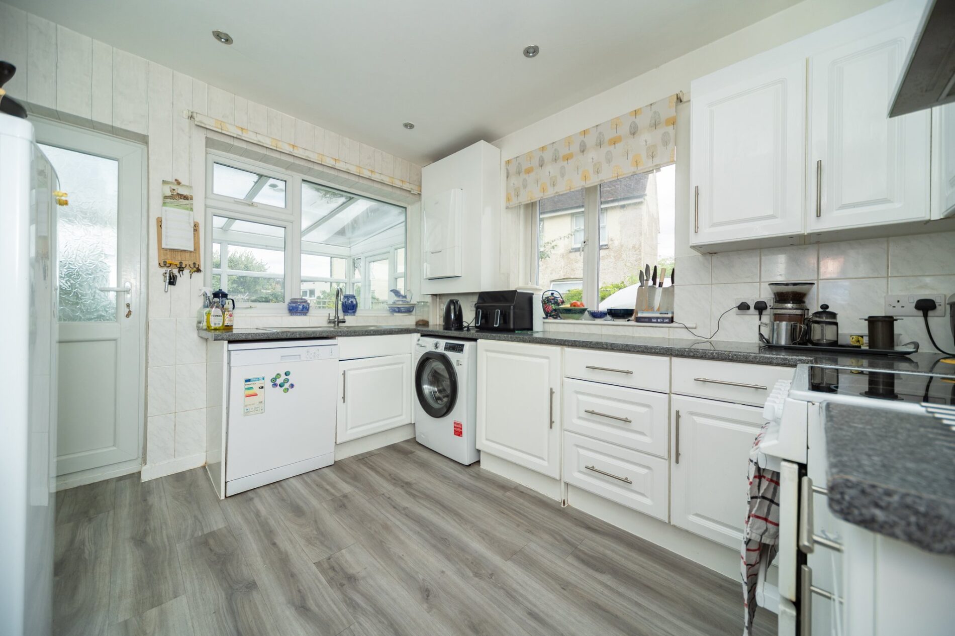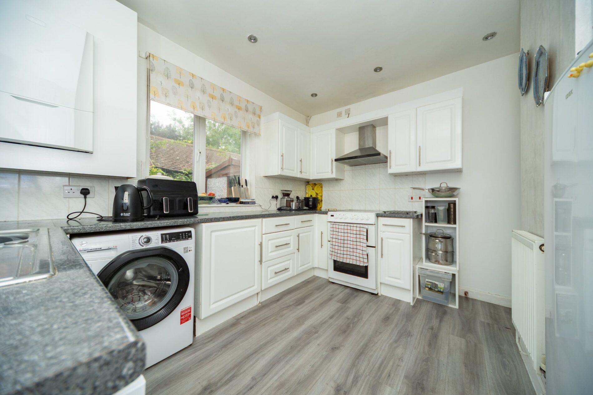 3.43m x 2.94m (11' 3" x 9' 8") With base and eye level units in white with contrasting granite effect work-tops, wall mounted central heating boiler, space for appliances, cooker extractor hood, radiator, ceiling down-lights, Upvc windows to rear and side and door to: