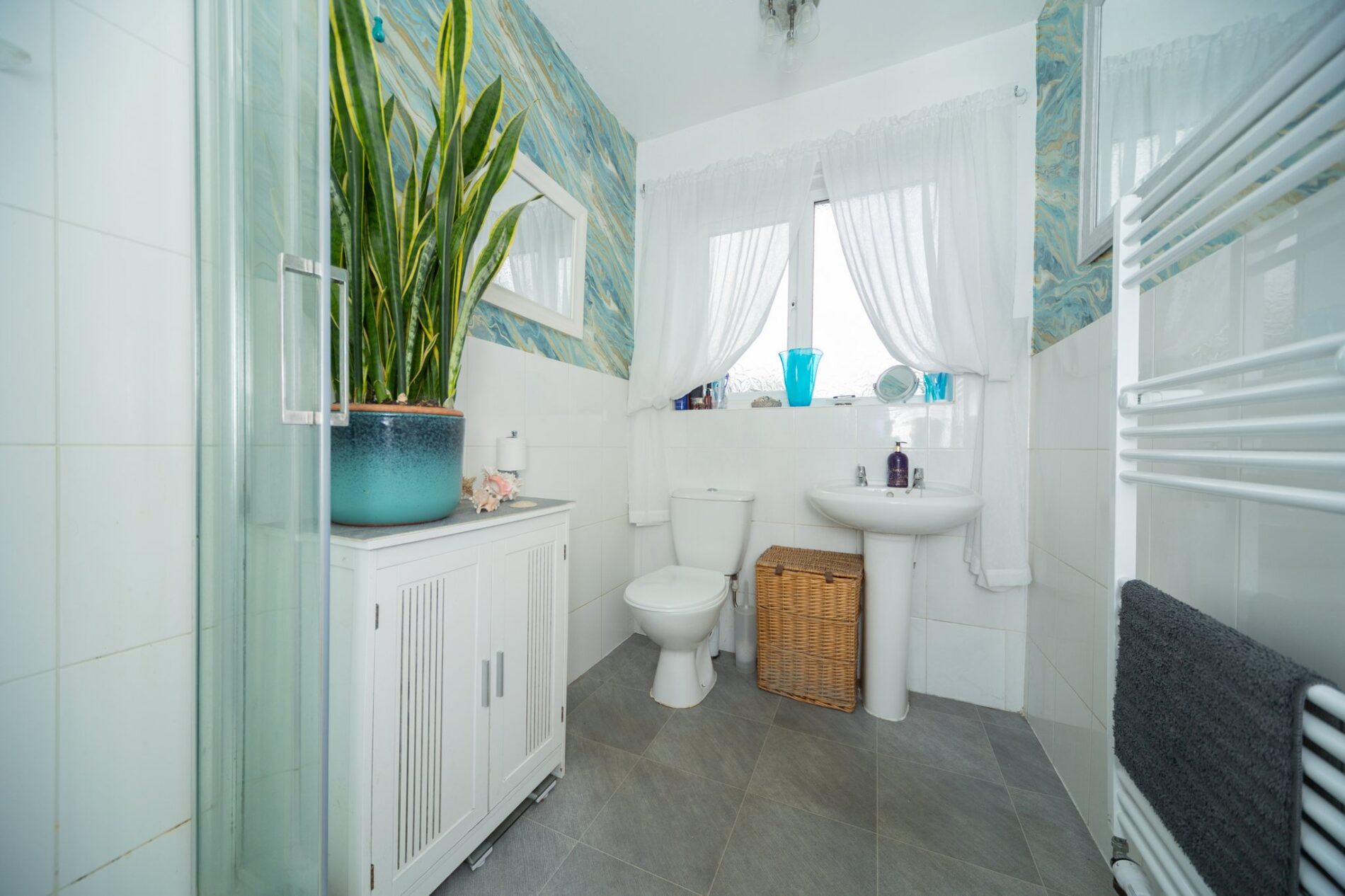 2.50m x 1.64m (8' 2" x 5' 5") With three-piece suite in white including quadrant shower cubicle, wash basin and close coupled WC plus wide towel radiator, ceiling lighting, half-height tiling and Upvc window to the rear elevation. A built in airing cupboard allows for linen storage.