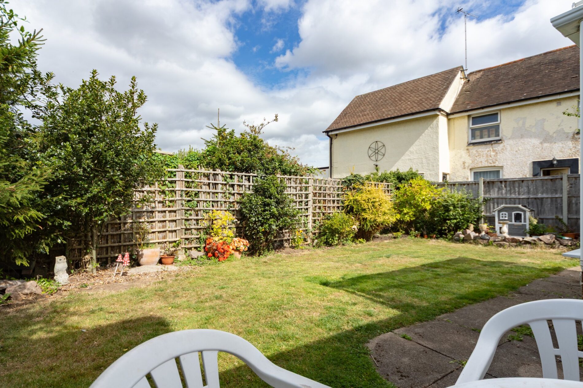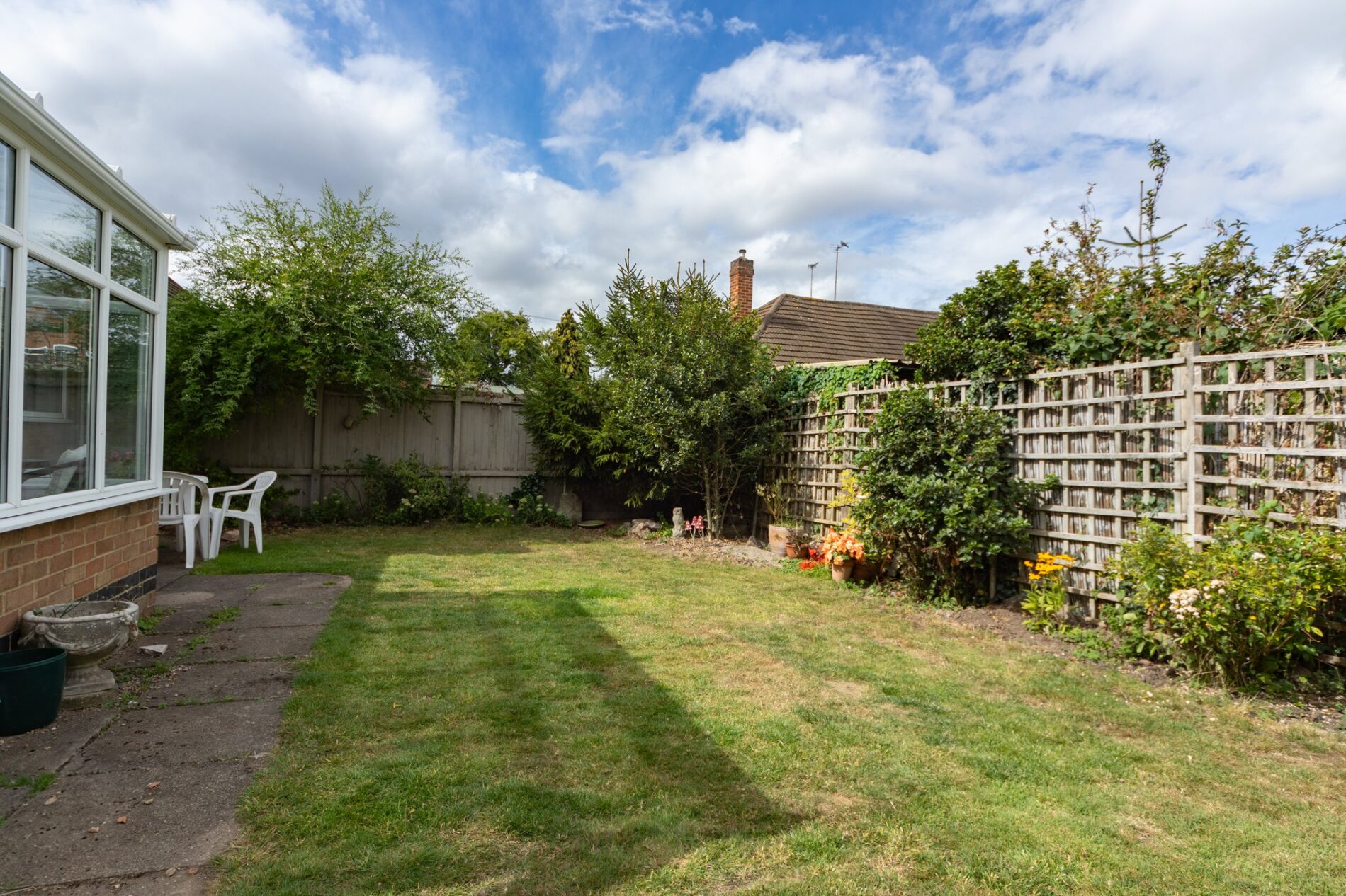 The garden wraps around the property with seating spaces to either side of the conservatory and a central flat/level lawn bordered with mature planting and flowers. A gated entry leads from the side patio space via the side of the garage to the porch and then the driveway and front garden.