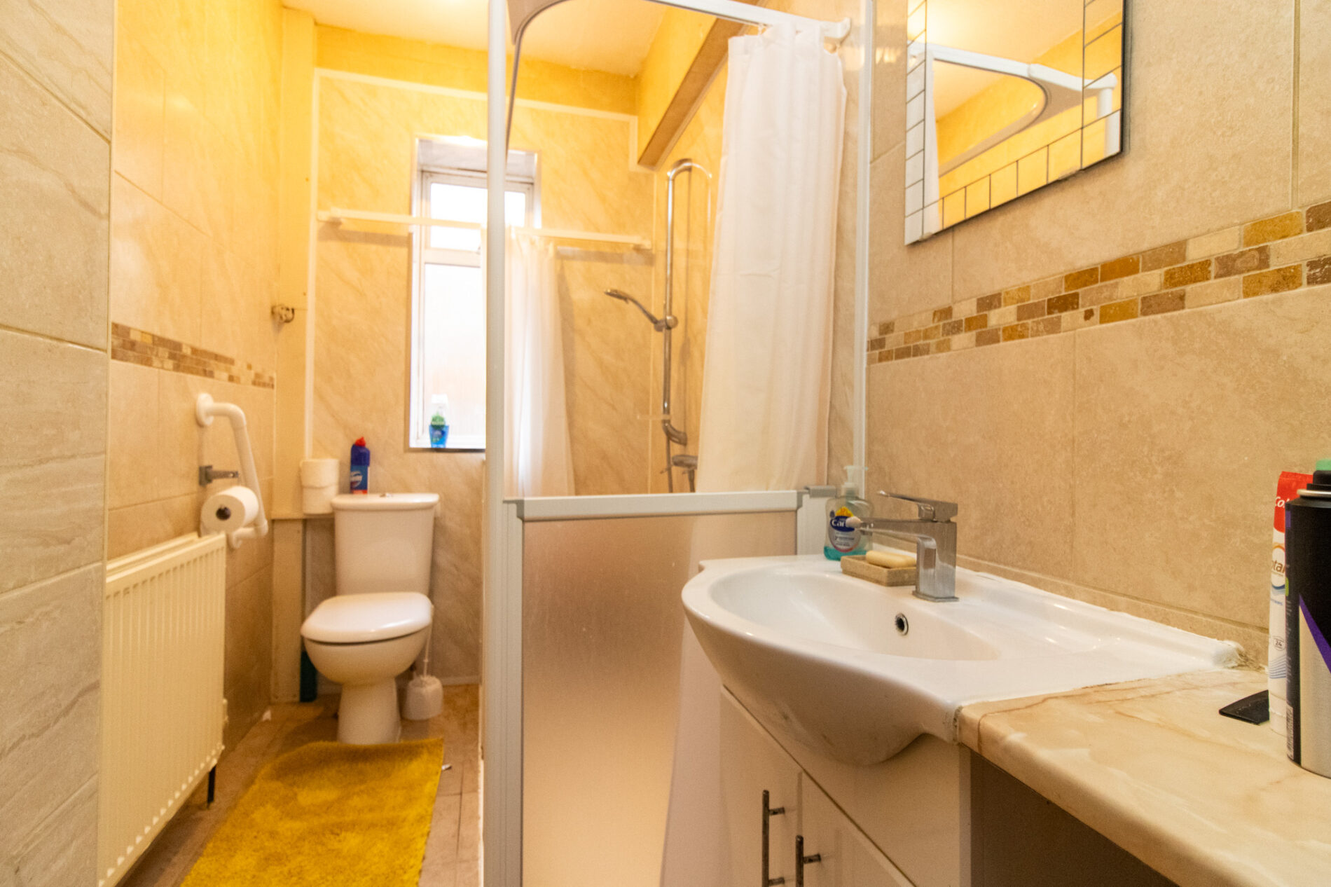 Three piece suite comprising walk in seated shower unit, pedestal wash hand basin and low level WC, large tiled splash backs, radiator, UPVC sealed double glazed window, tiled flooring.
