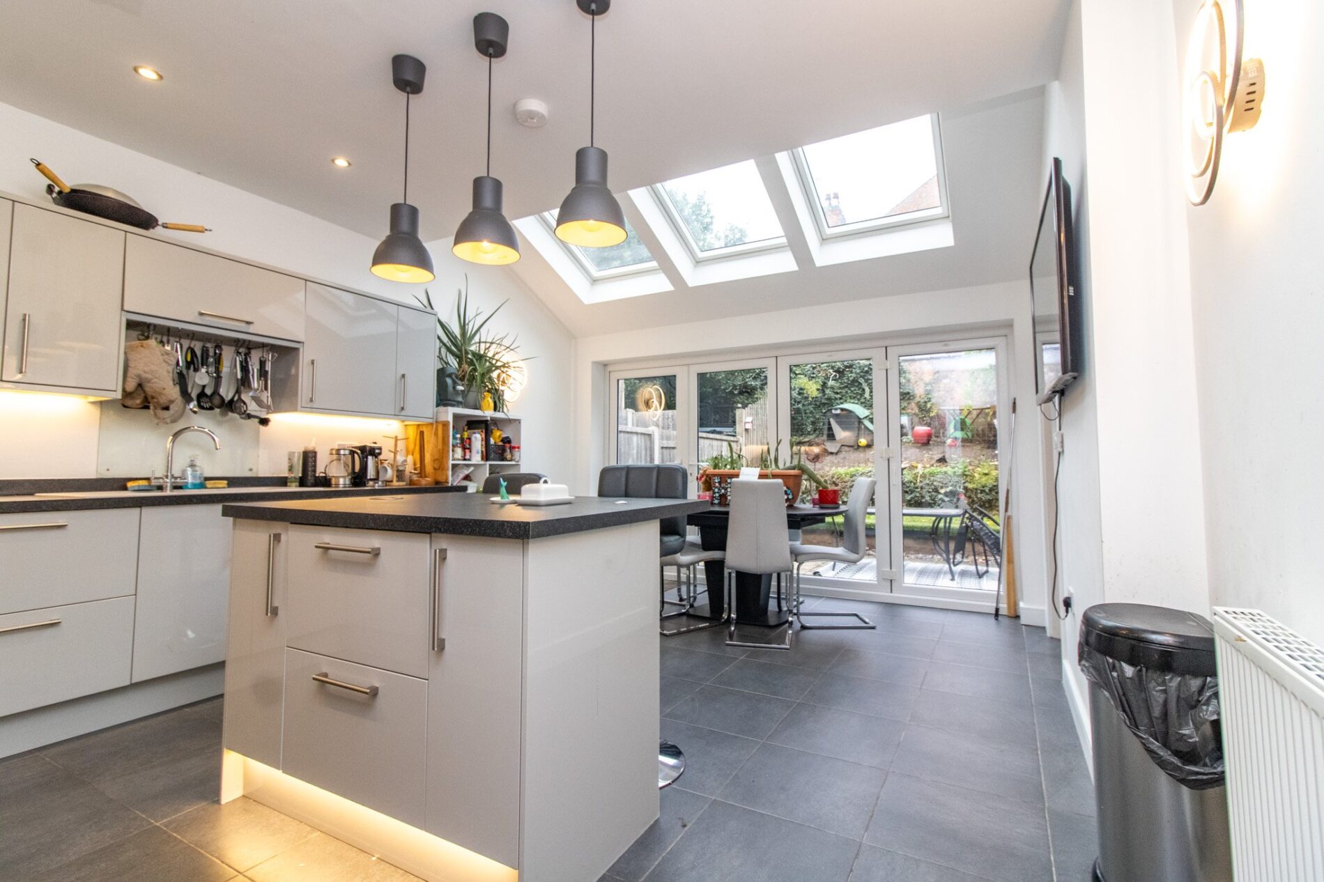 18' 5" x 15' 1" (5.61m x 4.60m) Nicely fitted in a range of soft close units comprising sink unit with cupboards under, matching range of base units with work surfaces over with matching upturn, drawers and cupboards under, complementary wall mounted eye level cupboards, deep pan drawers, integrated dishwasher and fridge/freezer, built in oven and four piece gas hob with extractor fan over set in stainless steel hood, easy wipe splash back, breakfast Island with cupboards and deep pan drawers under, UPVC sealed double glazed Velux window, concealed work surface lighting, bi-fold doors to rear garden.