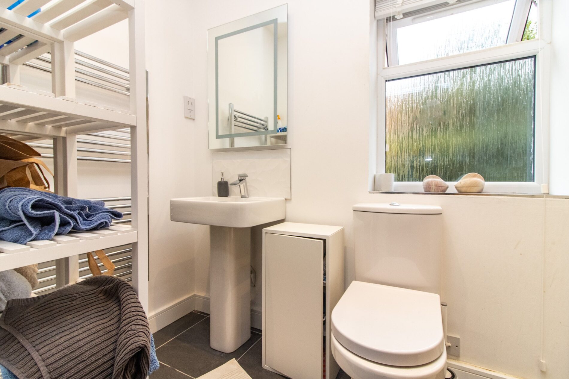 Low level WC and Vanity sink unit, radiator, UPVC sealed double glazed window