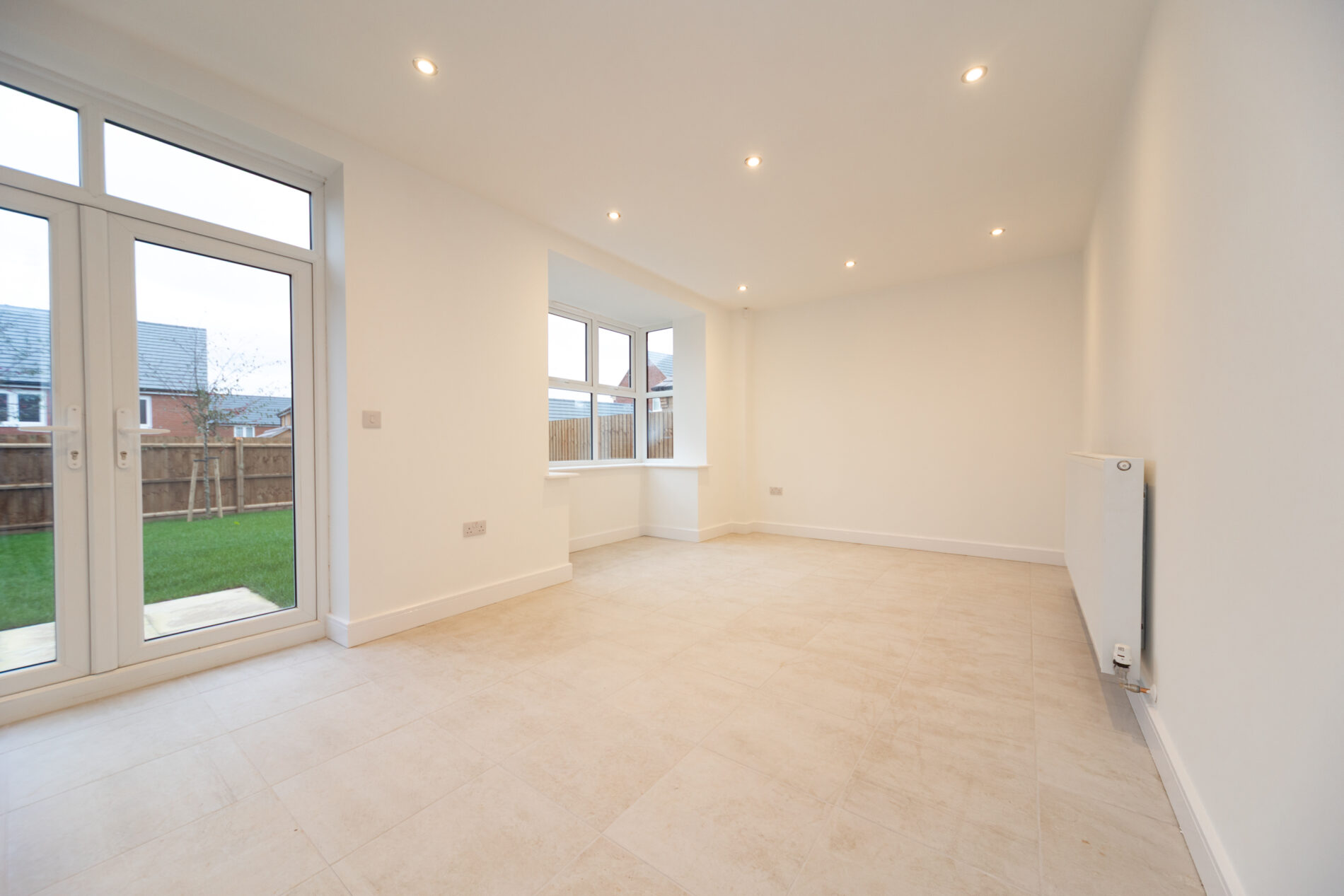 The dining and family seating space having a radiator and double glazed box bay window to the rear elevation. The kitchen attractively fitted with contemporary units, upgraded worktops and integrated appliances plus additional window and french doors to the rear elevation, downlights throughout and door to;