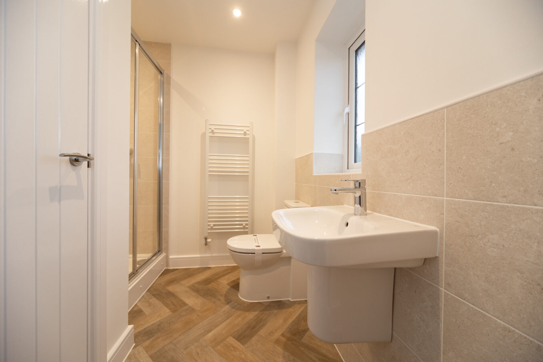 With airing cupboard with cylinder, shower cubicle, WC and pedestal basin. Towel radiator, extractor, ceiling light and window to the front elevation.