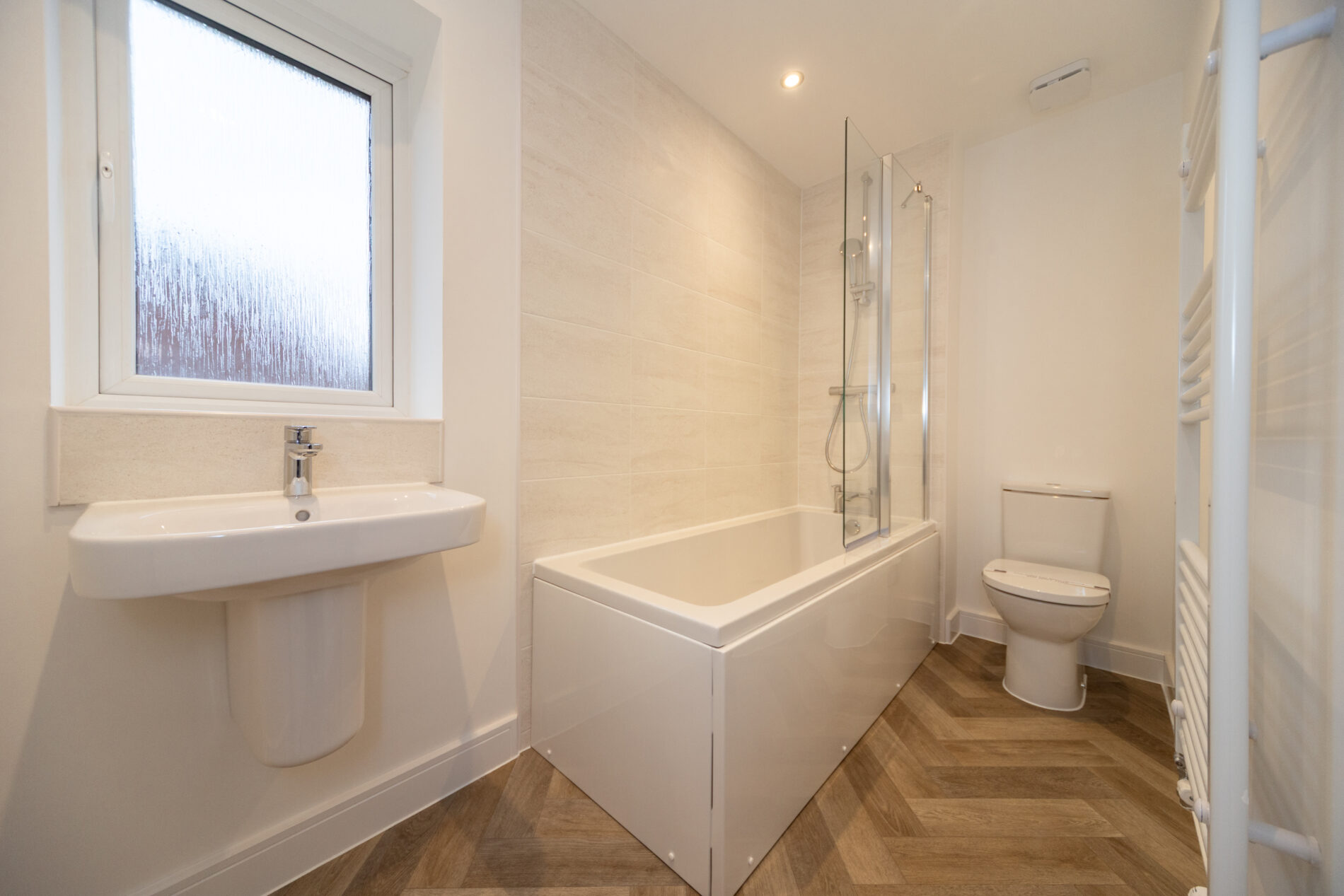 With window to the rear elevation, ceiling lighting, towel radiator and three piece suite including bath with shower, WC and pedestal basin.