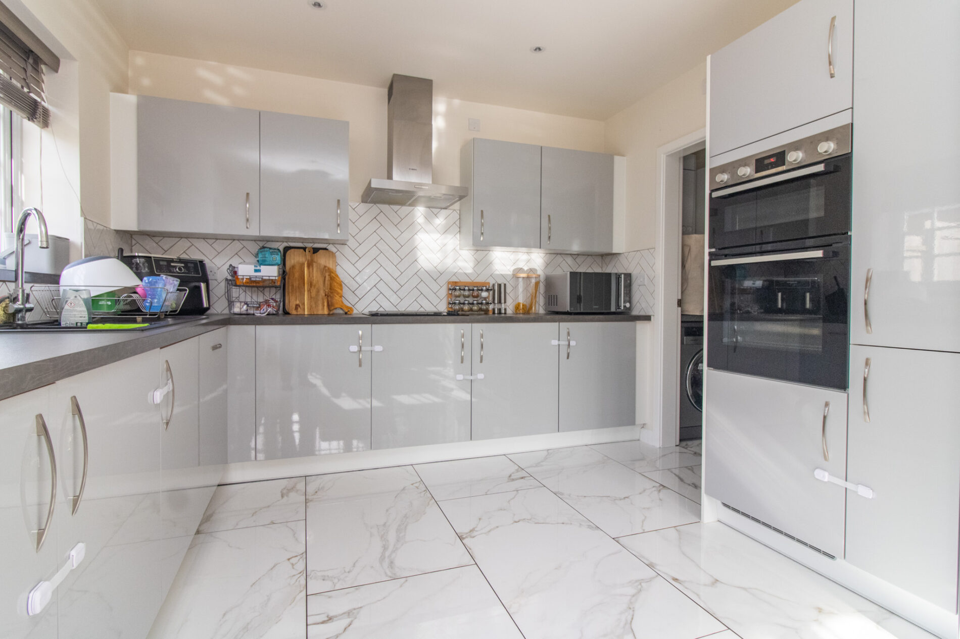 Fitted in a range of soft close units comprising one and a half bowl sink unit with cupboards under, matching range of base units with work surfaces over, drawers and cupboards, complementary wall mounted eye level cupboards, built in oven/grill and four piece ceramic hob with extractor fan overset in stainless steel hood, integrated dishwasher, UPVC sealed double glazed window, Carrera marble effect large tiled flooring, tiled splash backs, UPVC sealed double glazed French doors to rear garden.