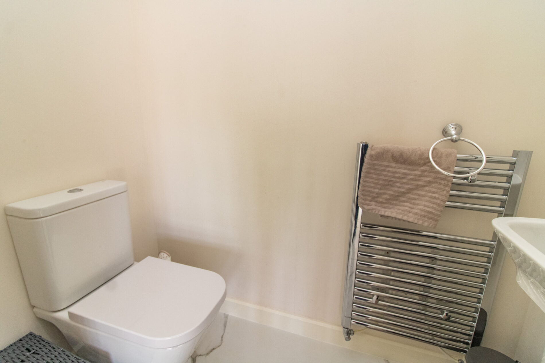 Low level WC and wash hand basin, heated towel rail, Carrera marble effect large tiled flooring.