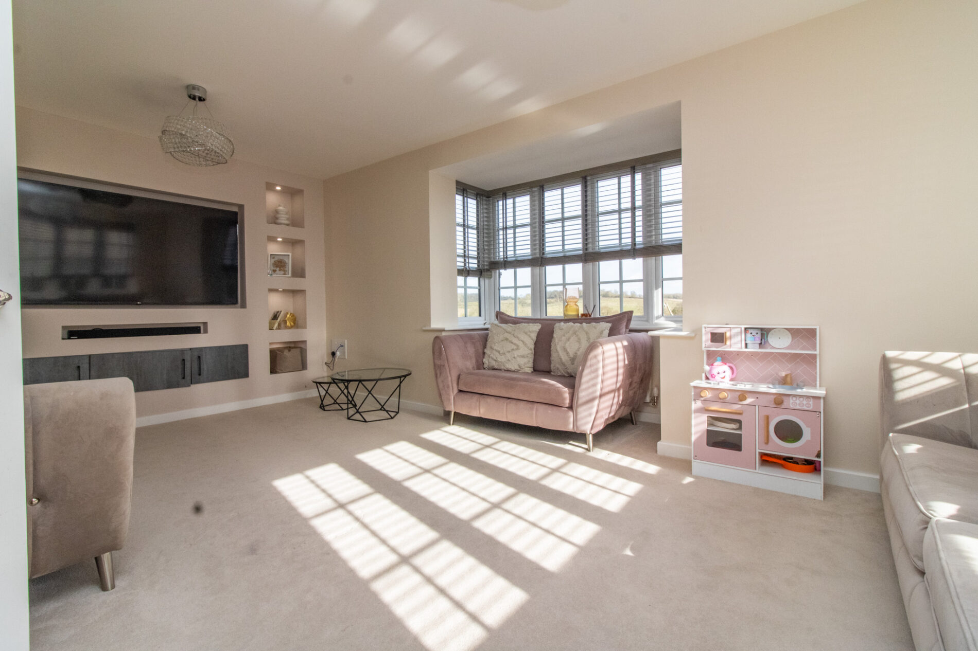 Feature media unit incorporating large TV space and display shelving, TV point, radiators, UPVC sealed double glazed side bay window with open aspect views across open countryside.