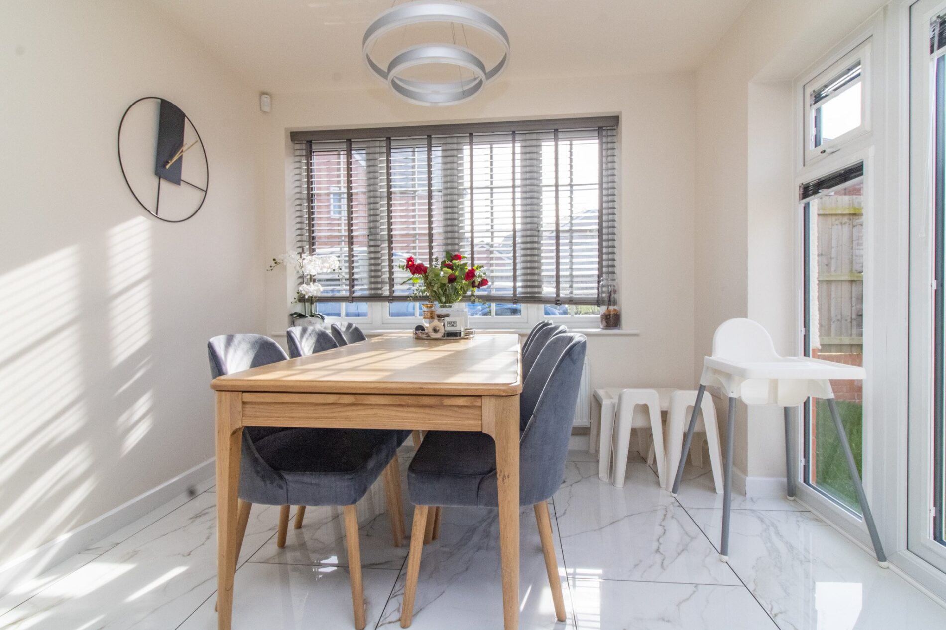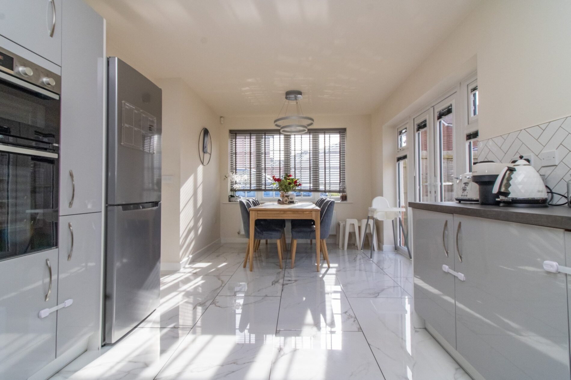 20' 0" x 10' 6" (6.10m x 3.20m) Fitted in a range of soft close units comprising one and a half bowl sink unit with cupboards under, matching range of base units with work surfaces over, drawers and cupboards, complementary wall mounted eye level cupboards, built in oven/grill and four piece ceramic hob with extractor fan overset in stainless steel hood, integrated dishwasher, UPVC sealed double glazed window, Carrera marble effect large tiled flooring, tiled splash backs, UPVC sealed double glazed French doors to rear garden.